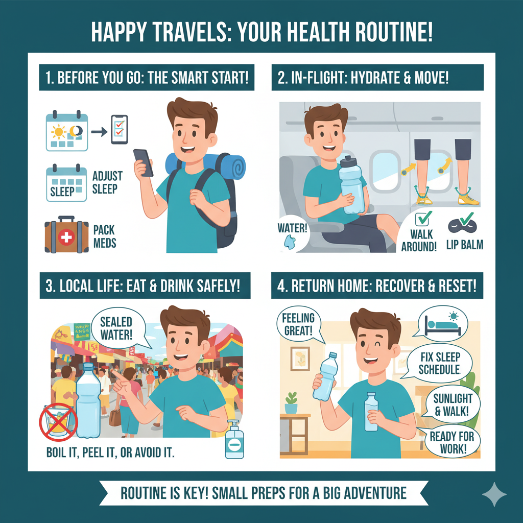 여행 건강의 핵심은 예방과 루틴입니다. 출발 전 체크리스트, 기내 수분·순환, 현지 위생, 상비약 준비, 귀가 후 회복까지—루틴만 갖추면 여행이 훨씬 가벼워집니다.
