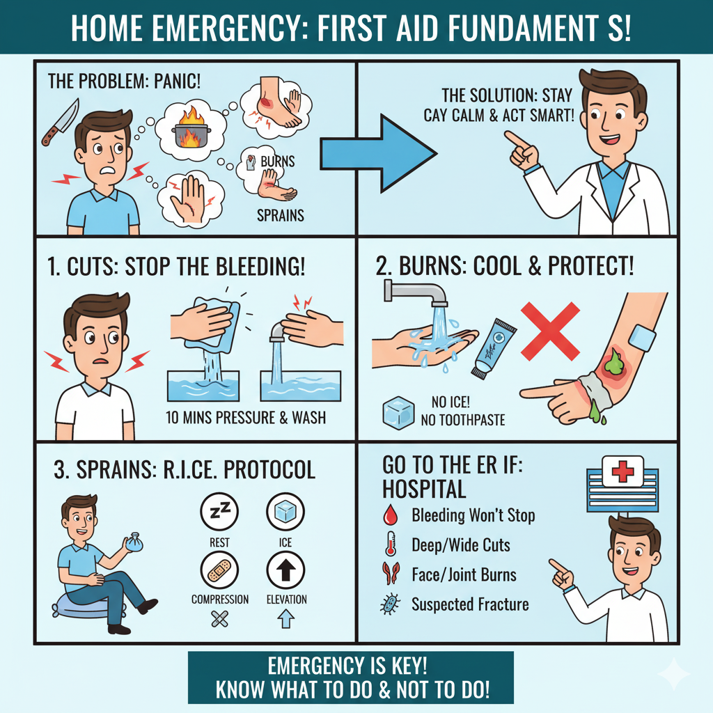 집에서 흔히 겪는 베임·화상·염좌. 당황해서 잘못 대처하면 상처가 커질 수 있습니다. 병원 가기 전 안전한 1차 응급처치를 정리합니다. (전문가의 진료를 대체하지 않습니다.)